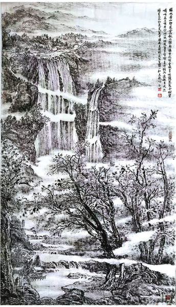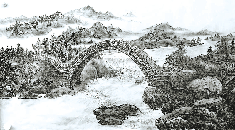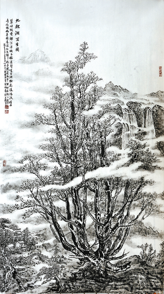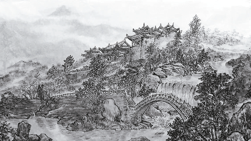 观陈文龙的作品,很难能不为所动,他笔下的黄山迎客松苍劲有姿、徽州老街古拙通幽、武夷山灵秀清雅,每件作品皆形神兼备,而作品全貌不仅有写实的真美,还有诗歌的意境美,观者仿若身临其境。对于绘画理解,陈文龙的追求也绝不仅限于此,以作品《三坊七巷》为例,画中线条粗细交错,色块明暗相生,巧妙地勾勒出地域特色与人文风情的同时,对自然的深刻感悟更让作品散发着哲学的思考,于宁静悠远中传递着人与自然和谐共生的美好愿景。在继承传统的过程中,陈文龙艺术之路始终坚持创新,他师古不泥,深耕历代名家技法,尤擅焦墨。其笔下线条苍劲豪放,用墨浓而不滞、黑而透亮,于虚实浓淡间尽显雄浑古朴之美。身为木兰溪畔的游子,他以焦墨或焦墨淡彩技法创作《木兰溪百景图》百幅系列,既展现全国十大“最美家乡河”的灵秀风貌,更是礼赞家乡木兰溪综合治理入选“人民治水、百年功绩”治水生态工程成就,实现传统技法和新时代内涵的融合。2021年6月,《木兰溪百景图》百幅系列作品作为建党百年献礼在仙游文庙展出,既是他“艺术服务社会”家国情怀的生动注脚,也是他作为民主党派成员对党百年伟绩的赤心呈现。