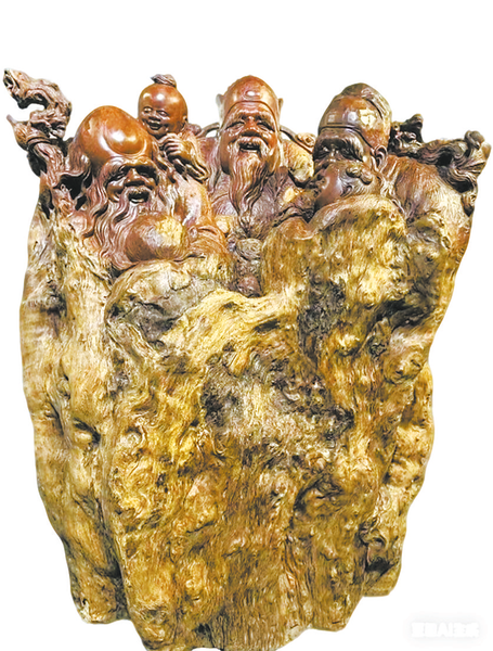 作品《福禄寿》采用历经七八百年岁月沉淀的龙眼古木为基,黄清銮凭借着精湛的技艺,赋予福禄寿三位神仙栩栩如生的形象。人物的面部表情刻画入微,笑容中透露出祥和与喜悦;服饰的纹理流畅自然,仿佛随风飘动;手中所持的器物也雕刻得精致细腻,每一个细节都展现出他对艺术的极致追求。