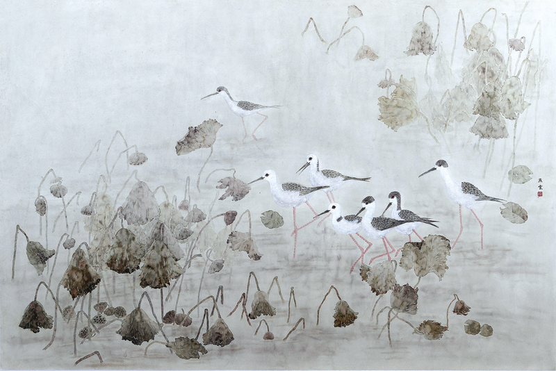 如今,我依然在法院工作,也依然在绘画的道路上不断探索。这两条道路,早已不再是彼此的羁绊,而是相互滋养、相互成就。法律的严谨,让我的绘画多了一份理性的秩序感;而绘画的自由,则让我的工作多了一份人文的温度。在《嫣然花语》《春意闹》《汀渚秋声》等作品中,我尝试用更丰富的色彩和更自由的构图,去表达对自然和生命的热爱。《嫣然花语》以九幅小品组成,每一幅都描绘了不同的花卉,配以题诗,如同一首首流动的视觉诗篇;《春意闹》则以满幅的繁花和飞舞的蝴蝶,展现了春天的勃勃生机;而《汀渚秋声》则以残荷与水鸟,描绘了秋日的萧瑟与宁静。这些作品,是我对自然的礼赞,也是自己对生命的感悟。